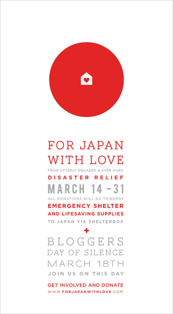 I'm sure all of you are well aware of the disaster happening in Japan. Every morning I sit in bed and watch the news, horrified at the devastation and so very grateful that my loved ones are safe, and feeling so blessed to be ok. I can't help but thinking that those affected are families just like mine, with children, jobs, and friends. They are no different than I am, and yet they are facing something I could never dream of. My heart and prayers truly go out to all those affected. And of course everyone should do all we can to help. Whatever you are able to give- prayers, donations, both...I know it will make an impact. You can donate to The Red Cross here, or join in the effort with the For Japan with Love project. As an additional show of support, I will be taking part in their Bloggers Day of Silence tomorrow, March 18th. If you are a blogger as well and would like to participate you can find out more info here. God Bless you and yours.