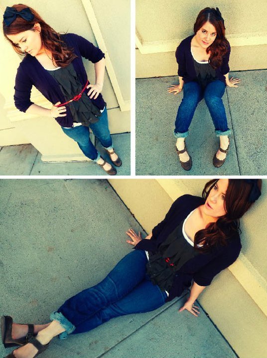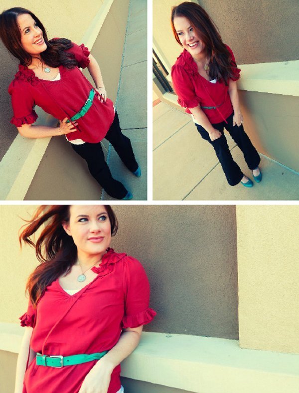 Hi guys! Happy Thursday! Today is my Friday cause I have tomorrow off. Thank goodness, cause I am sick again. Dang. At least its not strep throat this time- just a little cold. But, being the good little remixer I am, I slapped on some Vicks, downed some Dayquil and put on my Day 10 Outfit. I call this one "Whatever" cause it was pretty much everything that was hung together, and the red belt was on top of the pile. I rolled my jeans a la' J. Crew catalog and I was out the door. We're a third of the way there folks- here's where it starts to get tough.