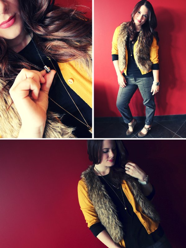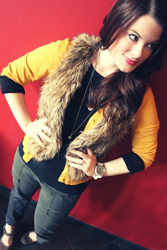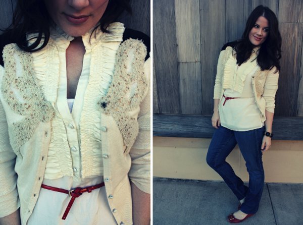 Bow Cardigan: Anthropologie | Sleeveless Ruffled Blouse: Gap | Red Belt: F21
