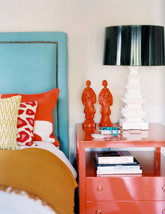 02.16.2010 And, according to Geoff, nothing goes with orange either. When we decided to live in sin, we each brought one bedside table to the mix. These bedside tables don't even come close to matching. Mine is painted black with a black & white striped top, and Geoff's is honey-colored wood. Lets just say neither goes with our chocolate leather upholstered headboard and blue-gray bedding. I love the eclectic look, and prefer things not to be too matchy-matchy, but these tables are so far out of left field that something must be done. So, I have been fantasizing about painting them both orange. Yes, orange. "Lauren, that's not very bedroom-y or soothing," you say...(and Geoff would agree) but I really think it might work. Besides, I've been dying to paint some piece of furniture in our bedroom orange since I saw this photo (below) of a room by amazing designer Ruthie Sommers. Awesome.