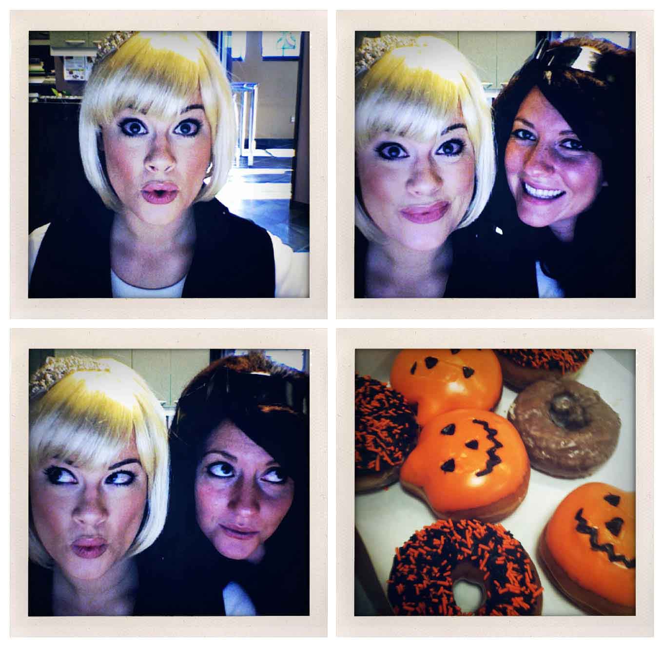 Happy Halloweenie my little goblins! Is everyone doing something fun for Halloween Weekend?! The hubs and I are headed to see Saw 6 3D tonight (yikes!) and then we are off to a big costume party on Saturday. I can't wait to arrive with these! And Costume Spolier alert (ok maybe not...) Geoff is going as a dirty old man & I am going to be his gold-digging trophy wife (Check out my cute blonde bob wig!) If you don't know us, then it might not make sense, but its sort of a running joke since we are 13 years apart. HAHA! And my coworker Natalie and I decided to wear our wigs to work for fun today and I have to say, we look pretty cute. Now off to enjoy some Halloween Krisy Kremes...